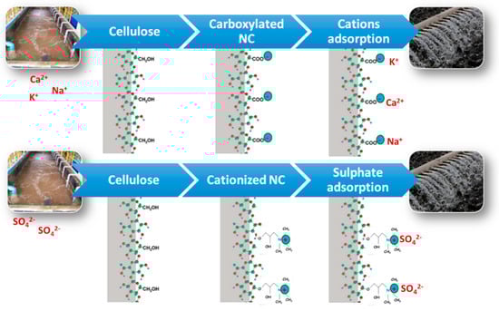 Carboxylation of NC is the most-used process, in which the high density of carboxylic acids (COO−) could react with cations, such as K+, Na+ and Ca2+, present in the wastewaters and remove them [133]. For removing sulphates, NC should be modified. Cationic NCs are efficient adsorbents to remove negatively charged water ions [135], such as nitrates, phosphates, fluorides, and sulphates (Figure 6). Additionally, cationic CNF displayed a higher selectivity toward multivalent ions (PO43− and SO42−) than monovalent ions (F− and NO3−) [136].