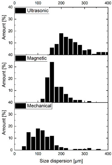 This explanation was proven by comparing the effects of mechanical (MM), electromagnetic (EMM), and ultrasonic mixing (USM) on the particle size development. Note that MM generated higher shear forces than that of EMM and USM (Figure 3). The particle dimensions and dispersion were measured using an Olympus BX-51 optical microscope (Hamburg, Germany) and the Stream Software for picture analysis. We calculated the size distribution of RP by measuring 100 particles per measurement on the fracture surface of broken Charpy specimens. In every case, the particle size was reported as the largest dimensions of the particles using the built-in size determination method of the software. Figure 5 shows the particle size distribution.