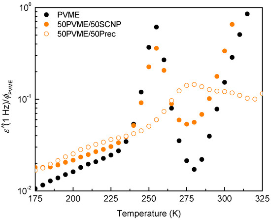 Figure 1 shows the temperature dependence of the dielectric loss ε″, measured at 1 Hz on the PVME homopolymer as well as on the mixtures with the precursor and with the SCNPs, respectively. Note that the ε″ values were normalized by the PVME weight fraction to get a relevant comparison of the intensity of the relaxation peaks among the different systems. For each sample, we observe a main loss peak corresponding to the -relaxation process. In the case of the blend with the linear precursor, the -relaxation peak is strongly modified with respect to that of neat PVME: The peak shifts to higher temperatures and displays a strong broadening. This behavior is very similar to that observed in the extensively-studied PVME/PS miscible blends [6,7]. The shift of the peak can be related to the slowing down of the PVME segment motions by the presence of stiffer precursor chains. Conversely, in the mixture with the SCNPs there is a decrease in the peak intensity without clear indications of any broadening or shifting of the main relaxation peak.