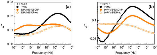 Dielectric loss curves for PVME (black symbols), the mixtures with the SCNPs (full symbols), and the precursor (empty symbols), at a temperature (a) below and (b) above .