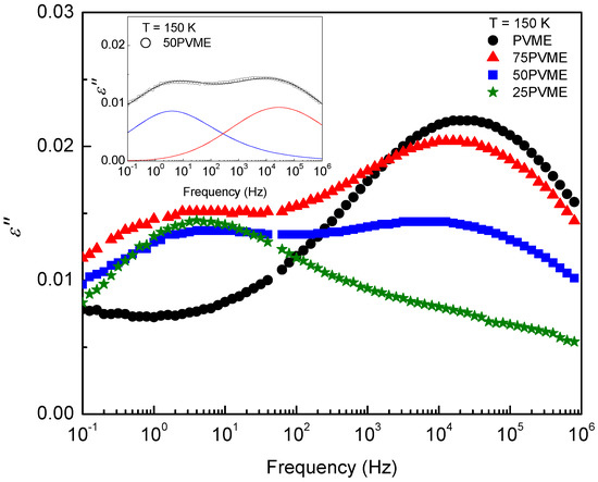 Figure 4 displays the dielectric spectra of the PVME homopolymer and the PVME/SCNP mixtures at 150 K, where only the secondary processes are observed. Although it is not evident forthe 25PVME mixture at the selected temperature in Figure 4, all the mixtures show a bimodality due to the -relaxation contribution from the SCNPs. There is an interchange of the intensity of the two relaxation components as the PVME fraction decreases. Interestingly, the secondary relaxation of the mixtures can be described by a simple superposition of the -relaxation of the components: