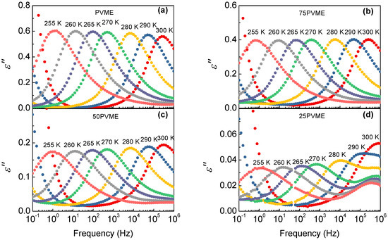 A comparison of the dielectric relaxation behavior of PVME with those of the mixtures above is shown in Figure 5. A main loss peak, corresponding to the PVME segmental dynamics, is detected, along with a much weaker higher frequency signal related to the secondary relaxation processes. Concerning the comparison of the -relaxations in the different samples, there are clear changes in the peak intensity but the differences in the widths and the peak frequencies are minor. Note that, as the PVME fraction decreases, the contribution from the secondary relaxation from the SCNPs is more noticeable and superimposes more with the -relaxation, mainly at higher temperatures (see Figure 5d).