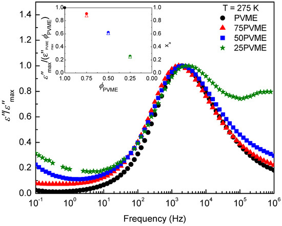 To gain insight into the existing differences among the dielectric -relaxation behavior of the mixtures and neat PVME, the normalized loss peaks at 275 K for PVME and for the mixtures are represented in Figure 7. The inset in Figure 7 shows the intensity of the corresponding loss peaks, normalized by the PVME concentration , as a function of PVME concentration. It is noticeable that the resulting values are lower than the ones for the mixtures, an indication of a lack of PVME dipoles contributing to the main loss peak frequency. This effect increases as the PVME fraction in the mixture decreases. When comparing the normalized curves, it is found that, as the PVME fraction decreases, a high frequency broadening, which is directly attributable to the presence of a secondary relaxation from the SCNPs, is observable. Besides, there is a lower frequency signal which increases with the concentration of SCNPs, which would be related with the slower motions of the PVME segments in the mixtures.