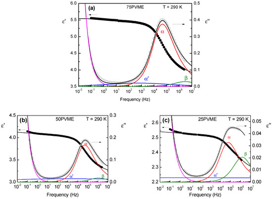 Dielectric spectra of (a) 75PVME, (b) 50PVME, and (c) 25PVME at K. Solid black lines are the fitting curves obtained by the addition of -relaxation (red), an additional slow process (blue), -relaxation (green), and DC-conductivity contribution (magenta).