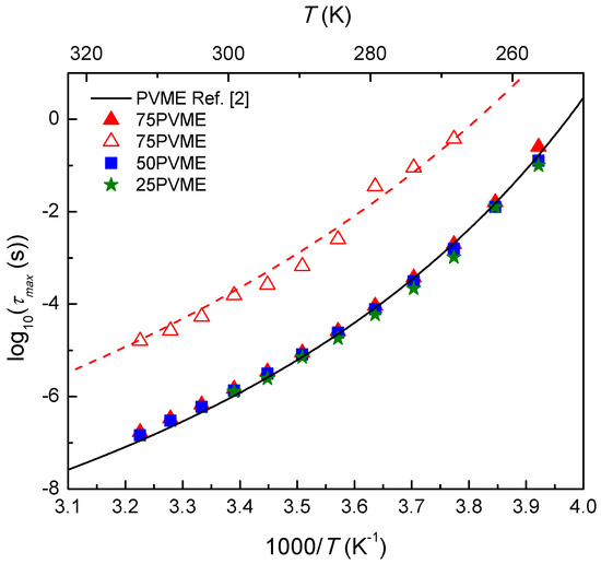 where is given by Equation (1), corresponds to neat PVME -relaxation function, the dielectric relaxation strength is fixed to that determined for neat PVME, corresponds to the direct current (DC) conductivity, and would represent the fraction of PVME segments in the mixture barely affected by the presence of SCNPs. The solid lines in Figure 8 correspond to the different contributions. As expected from the direct data comparison, the peak frequencies of the PVME-like components overlap well with that of neat PVME (see Figure 9). Moreover, the corresponding fractions of PVME segments in the mixtures that are barely affected by the presence of SCNPs are close to the ratio of the loss peak intensities presented above (see inset in Figure 7). Thus, it can be confirmed, that when increasing the SCNP amount, the fraction of PVME segments strongly influenced by the SCNPs rapidly increases. On the contrary, for low SCNP amounts, there is a large fraction of PVME segments with a dynamic behavior indistinguishable from that of pure PVME. A rough calculation, based on a simple two-phase picture, would indicate that, for 75PVME, there exists a SCNP-rich phase with about 28 wt % PVME. For 50PVME, the SCNP-rich phase would contain about 28 wt % PVME and, for 75PVME, the SCNP-rich phase would contain about 24 wt % PVME. This finding can be interpreted as indicative of the fact that the SCNPs can incorporate a maximum amount of PVME segments. From the previous values, we estimate the PVME amount that is actually incorporated into the SCNPs in any mixture to be about 33 wt % of the SCNPs weight.