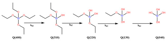 The polymerization rates of the alkoxysilanes can be expressed in different ways, depending on which reaction is monitored, e.g., first hydrolysis, overall hydrolysis, condensation, re-esterification, or gelation. The hydrolysis reaction can have up to four reaction rate coefficients (kh), depending on the existence of hydrolysable groups in the alkoxysilanes or organoalkoxysilanes, e.g., triethoxysilane (TEOS) (Figure 3). The rate constants could be in the ratio (4:3:2:1) [6], or they could have completely different values depending on the catalyst and solvent, as in the case of γ-glycidoxypropyltrimethoxysilane (GPS) [26]. Some articles, however, reported a single overall rate constant, kh, for the hydrolysis process [36,37].