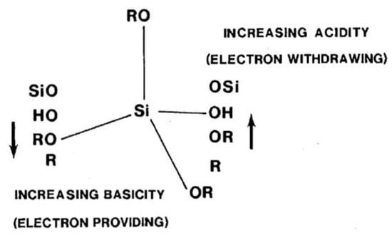 It is well known that electron providing substituents increase hydrolysis in acidic media and decrease it in basic media, and vice versa [4,36,38] (Figure 7). This is known as the inductive effect. Many researchers reported that the organo group (R), which contained amino, carbonyl, or ester groups, enhanced the hydrolysis reaction [46,47,65] by interacting amongst themselves or with neighbouring silicon moieties. Salon et al. [23,60,62,65] studied the hydrolysis of different trimethoxy and triethoxy silanes at different conditions (pH, water content, etc.). Although they were not working quantitatively, they showed that the chemical structures had a direct impact on the hydrolysis rates and the distribution of the hydrolyzed species in the reaction medium. For example, they found that the hydrolysis rate was enhanced with increasing the number of amino groups in the silanes. They also reported that the transesterification (solvolysis) of some nitrogen bearing trialkoxysilanes with methanol and ethanol as solvents, in the absence of water and catalysts, depends on the chemical structure of the organo groups [23]. The hydrolysis rate of the (CH3)x–Si–(OC2H5)(4 – x) silanes increased with increasing the substituent, x, which ranged from 0 to 2 in an acidic medium, which could have been due to an inductive effect [37]. Nearly the same results were obtained by Altman and co-workers [46].