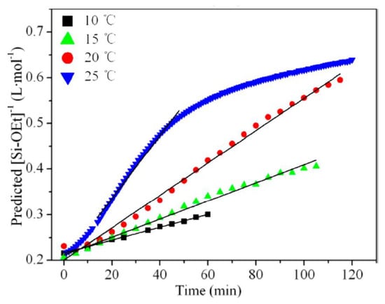 [Si-O-ethyl]−1 of MTES hydrolysis at different temperatures at [H3O+] = 1.468 × 10−4 M. Reprinted with permission from [37]. Copyright American Chemical Society, 2014.