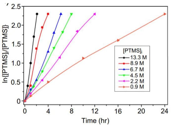 Kinetic rate plots for various [PTMS]i, [H2O] = 30 M, at 25 °C. Reprinted with permission from [29]. Copyright Elsevier, 2016.