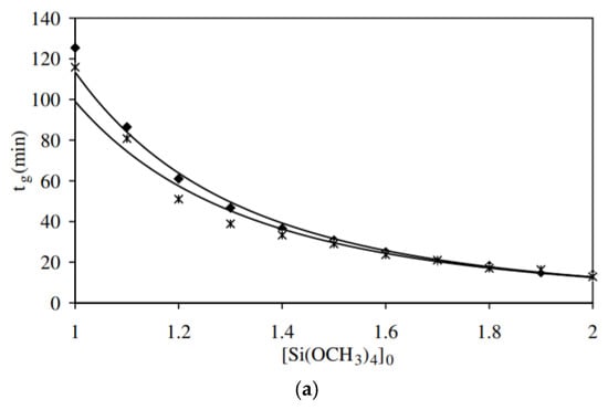Rate constants were reported for hydrolysis, condensation, or both. Initially, some researchers used the Hammett and Taft equations to find a correlation between the hydrolysis rate and the alkoxysilane structures [31]. The hydrolysis rate was found to be enhanced as the pKa of the leaving group parent increased, while no correlation could be found between the organic appendages and the rate constants [39]. Recently, researchers tried to find empirical correlations between the rate constants by regression. The hydrolysis and condensation rates of TEOS in an alkaline medium were calculated by using Equations (8) and (9) [36]: