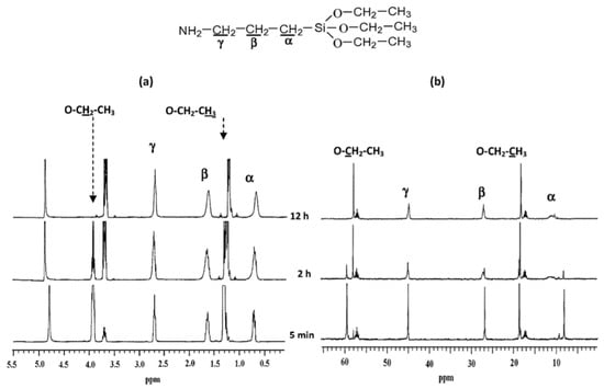 - Brochier Salon, M.C.; Bardet, M.; Belgacem, M.N. Solvolysis-hydrolysis of N-bearing alkoxysilanes: Reactions studied with 29Si NMR. Silicon Chem. 2008, 3, 335–350. [Google Scholar] [CrossRef]