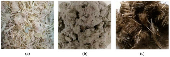 Selected fibers: (a) fiber-reinforced plastic (FRP); (b) lignin fiber; (c) basalt fiber.
