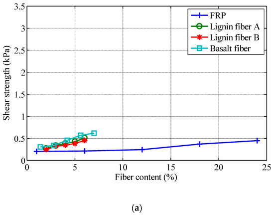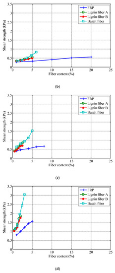 Shear strength of fiber-reinforced asphalt with various fiber contents: (a) asphalt No. 90; (b) asphalt No. 70; (c) styrene-butadiene-styrene (SBS) modified asphalt; (d) asphalt rubber.
