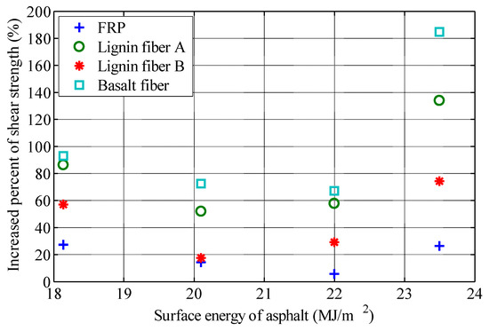 In order to analyze the relationship between interface properties and fiber reinforcement properties, the increase percent of shear strength (IPSS) of fiber-reinforced asphalt with 2% content (fiber mass by asphalt mass) is calculated with reference to the shear strength of asphalt without fiber. The surface energy of fiber, the surface energy of asphalt, and the work of adhesions are plotted, respectively. The relationship between interface characteristic parameters and IPSS are shown in Figure 5, Figure 6 and Figure 7.
