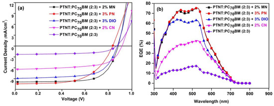 Photovoltaic devices with and without solvent additives: (a) representative current density–voltage curves; (b) EQE versus wavelength.