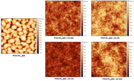 Different solvent additives have been used to process the photoactive layer, as reported in earlier studies. The purpose here was to identify whether less harmful additives would tune the nanomorphology better than their harmful counterparts. Using non-halogenated MN and PN, the intermixing of donor–acceptor moieties was immensely enhanced, promoting the efficient charge transport as investigated in the AFM study. It is important to note, however, that the inner morphology of the BHJ devices can be different as AFM is a surface-sensitive technique [37,38].
