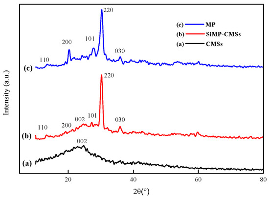 To further analyze the structural changes of the CMSs, both the CMSs and the SiMP-CMSs were tested by XRD, and the results are shown in Figure 4. The diffraction peak in the XRD pattern of the CMSs appeared at 24.5°, corresponding to the (002) reflection of the graphite. The diffraction curve of the MP in Figure 4b revealed five main diffraction peaks for neat MP. The peaks were observed at 2θ of 13.5°, 20.2°, 27.9°, 30.3°, and 36°, corresponding respectively to the (110), (200), (101), (220), and (030) crystal face diffraction peaks of MP [15]. Compared to the neat CMSs and MP, the characteristic diffraction peaks of the CMSs and MP appeared at the same position in the XRD profiles of the SiMP-CMSs (Figure 4c). These data further demonstrated that SiMP can successfully be formed on CMSs.