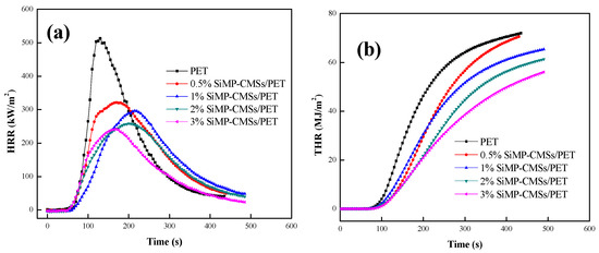 Heat release rate (HRR) (a) and total heat release (THR) (b) curves of SiMP-CMSs/ Poly(ethylene terephthalate (PET) composites.