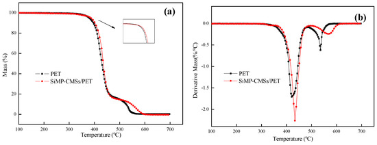 TGA (a) and DTG (b) curves of the SiMP-CMSs/PET composites in the air atmosphere.