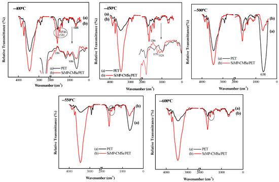 As the thermal temperature further rose to 550 °C or 600 °C, the cross-linked char structure at 1516 cm−1 remained unchanged, but the vibration intensity became higher than that of pure PET, explaining the reason for the higher thermal oxygen stability of the char layer formed by the SiMP-CMSs/PET when compared to that formed by pure PET.