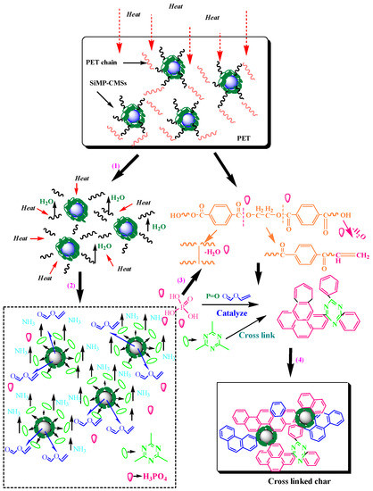 Taking into account the above analyses, the flame retardant mechanism of SiMP-CMSs for PET is mainly associated with the three aspects shown in Figure 11. First, CMSs played a role in the heat insulation effect, partially catalyzing the char effect by vinyl formate (decomposition products of the CMSs themselves). Second, the SiMP present on the surface of the CMSs decomposed phosphoric acid and melamine, where the phosphoric acid promoted the char layer of the PET in the condensed phase and reduced the matrix amount to producing smoke. The P=O bond deactivated the char layer and increased its barrier properties, cutting off the release of smoke. Third, the melamine vaporized and covered the upper polymer surface, and then decomposed to generate ammonia and nitrogenous gaseous products that diluted the O2 concentration and inhibited the flame by blocking the way of smoke suppression. The triazine ring structure existed in the char structure by promoting the cross-link of the PET, which improved the thermal-oxidative stability of the char and lowered the smoke amounts. These three aspects ultimately made the PET matrix simultaneously achieve flame retardancy and smoke suppression.