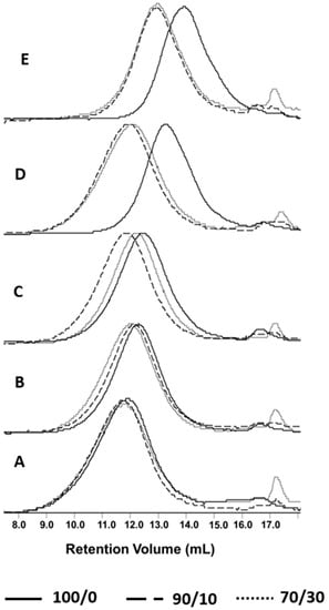 Overlay of selected GPC elugrams of the pure P(3HB-co-4HB) (100/0) and P(3HB-co-4HB)/cork composites with the mass ratio of 90/10 and 70/30, respectively, before (A) and after 21 days of degradation in a respirometer (B), BIODEGMA (C), container (D) and water (E).