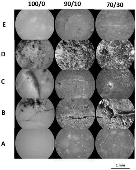 Photomicrographs (120x) of the pure P(3HB-co-4HB) (100/0) and P(3HB-co-4HB)/cork composites with a mass ratio of 90/10 and 70/30, respectively, before (A) and after 21 days of degradation in a respirometer (B), BIODEGMA (C), container (D) and water (E).