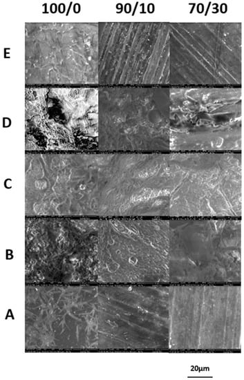 SEM micrographs (5000x) of the pure P(3HB-co-4HB) (100/0) and P(3HB-co-4HB)/cork composites with a mass ratio of 90/10 and 70/30, respectively, before (A) and after 21 days of degradation in a respirometer (B), BIODEGMA (C), container (D) and water (E).