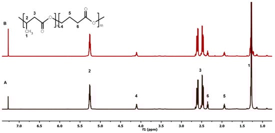 1H NMR spectrum of P(3HB-co-4HB) before (A) and after 21 days of degradation in distilled water (B).