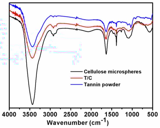 Fourier-transform infrared (FTIR) spectra of tannin powder, cellulose, and immobilized tannin/cellulose (T/C) microspheres.