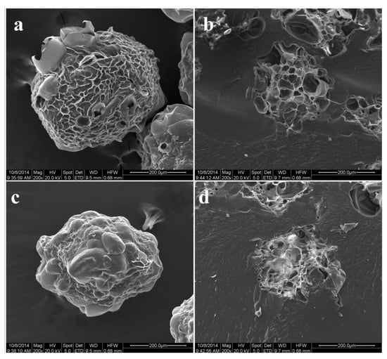 The surface and cross-section morphologies of T/C microspheres (a,b) and cellulose microspheres (c,d).