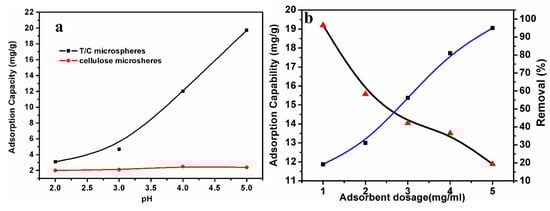 Figure 3a shows the effects of pH on Pb(II) ion adsorption onto the T/C microspheres and cellulose microspheres. Cellulose microspheres exhibited a limited ability of adsorption, suggesting the ineffective combination with Pb(II) ions. After tannin immobilization, T/C microspheres showed a competitive ability for the adsorption of Pb(II) ions. The scheme suggests that a high concentration of OH− favors adsorption, whereas a high concentration of H+ ions suppresses the adsorption reaction. An obvious enhancement in adsorption was recorded upon increasing pH in the range of 2–5. The adsorption capacity showed an increase from 3 mg/g to 19 mg/g, demonstrating that the pH of the solution has great influence on lead-ion adsorption onto microspheres. It was reported that solution pH can influence the aqueous chemistry of dye molecules, surface binding sites, and surface charges of the adsorbent []. At lower pH, the surfaces of microspheres were occupied by H+ protons, leading to a decrease in Pb(II) ion removal capacity. Furthermore, the activity of tannins on cellulose as adsorption sites for removing Pb(II) ions was due to the phenolic hydroxyls on molecules. However, at lower pH, the ionization of phenolic hydroxyls was suppressed, resulting in the lower adsorption capacity of microspheres. With an increase in pH, the increase in negatively charged sites and ionization of tannins led to the increased affinity between microspheres and the positively charged metal ions. This adsorption behavior at pH 2–5 was similar to the cationic dye adsorption on T/C microspheres in our previous work [].