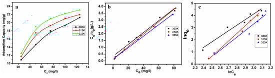 Adsorption isotherms are very important for designing adsorption systems, revealing the distribution of metal ions between the liquid phase and the solid adsorbentin the equilibrium state during the adsorption process. Figure 4a shows the Pb(II) ion adsorption at 303, 313, and 323K. The adsorption capacity of Pb(II) was significantly increased with the increase of Pb(II) concentration in the low concentration region, and gradually reached an equilibrium at higher Pb(II) concentration. The adsorption capacity of microspheres lightly increased with the increase of temperature, indicating that temperature did not have a significant effect on adsorption capacity. However, adsorption capacity increased obviously from 12.3 to 22.3 mg/g upon increasing the initial concentration of Pb(II) solution. In this work, Langmuir and Freundlich adsorption isotherms were applied for this study to describe the adsorption behaviors of Pb(II) ions onto T/C microspheres, and theyare described in their linear forms according to Equations (3) and (4) [,], respectively.
