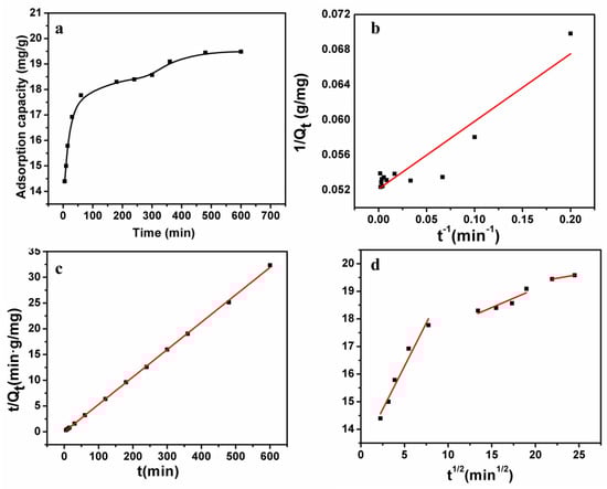 where t is the adsorption time (min), Q1 (mg/g) is the maximum adsorption capacity for the pseudo-first-order adsorption, Q2 (mg/g) is the maximum adsorption capacity for the pseudo-second-order adsorption, k1 (1/min), k2 (min·g/mg), and kp (mg·g−1min1/2) are the rate constants for the pseudo-fist-order, pseudo-second-order, and intraparticle diffusion models, respectively, and C is a constant.
