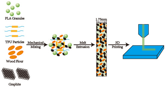 In addition to the consideration of environmental issues and resource shortages, it is important to choose an applicable polymer as the matrix of the composites. As a biodegradable and environment-friendly bioplastic [10,11], polylactic acid (PLA) can be produced by corns and other food crops [12,13,14] and has been widely used as matrixes for Fused Deposition Modeling (FDM) technology recently [15,16]. However, the brittleness and high cost of PLA limits its application [17]. Therefore, the addition of natural fibers, which are also biodegradable [18,19] for example, the adding of wood flour (WF) into PLA, may be an efficient way to reduce the cost and reinforce the PLA [20,21]. Patanwala et al. used carbon nanotubes and PLA to prepare FDM filaments by melt extrusion. When 5 wt% of carbon nanotubes was added, the Young’s modulus of the composite was improved, but the tensile strength decreased [22]. Daniel et al. compounded PLA with carbon black and graphene respectively using the FDM technology. After the filament was extruded by FDM, its resistivity decreased compared with that before the extrusion [23]. Yu et al. introduced graphene or carbon nanotubes into PLA and obtained filaments suitable for FDM by multiple melt extrusion. The incorporation of graphene or carbon nanotubes significantly reduced the electrical conductivity of the PLA-based composites [24].