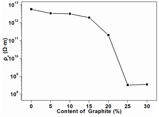 Figure 2 shows the volume electrical resistivity of the composites as a function of the graphite content. Three replicates were tested in each group to obtain the average value, and the standard deviation was calculated, which was equal to 0. The volume electrical resistivity of the composite without graphite was calculated to be in the order of 1012 Ω·m. It was clearly shown that, with the increase of graphite content, the volume electrical resistivity of the composites gradually decreased, but the order of magnitude did not change. When the added amount exceeded 15 pbw, the volume resistivity of the composites significantly decreased, which meant that the conductive paths in the composite began to form and the graphite began to contact with each other. Until the content reached 25 pbw, the magnitude of the resistivity reached the lowest value (108 Ω·m), which indicated that the conductive path in the composite was completely formed at this time. The volume electrical resistivity of the composites dropped significantly between 15 pbw and 25 pbw, and at which point the electrical conduction path formed by graphite in the PLA matrix reached the percolation threshold [36]. As graphite continued to be added into the composites, the resistivity no longer changed in magnitude. This phenomenon indicated that the percolation threshold for the electrical conductivity of the composites was lower than 25 pbw. The formation of the percolation threshold was mainly attributed to the better conductive network constituted by graphite. The contact resistance also existed in the percolating network formed within the composites [37].