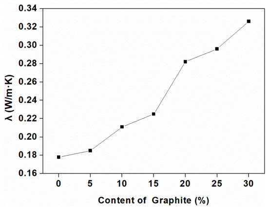 Figure 3 shows the thermal conductivity of the composites as a function of the graphite content. Three samples were tested and averaged of each group, and the standard deviation was calculated to be very small, so it could not be reflected on the graph. It can be seen that the thermal conductivity increased at higher graphite content. This was shown that the transport path required for high thermal conductivity was greatly improved by the average carbon free path and the conductive network produced by adding graphite [37], and the fact can be explained by the morphology of the composites showed in Figure 4.