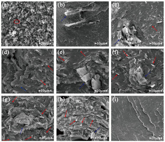 It can be seen in Figure 4 that the blue arrow pointed to the wood flour, and the red arrow stood for the graphite dispersed in the matrix. The neat graphite appeared like a sheet-like flake (for example in the red cycle of Figure 4a). It can be seen in Figure 4i that the fracture surface of pure PLA was smooth, meaning that a typical brittle fracture was obtained. In Figure 4b–h, it can be seen that graphite flakes disperse randomly in the polymer matrix [38]. With the increase of the graphite content, the dense conductivity network was formed and the graphite flakes contacted each other, which meant the formation of the conductive paths.