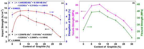 The impact strength and elongation at break of composites with different contents of graphite are shown in Figure 5. With the addition of graphite, the impact strength firstly increased and then decreased. With the loading content of 5 pbw, the impact strength of the composite was the highest, reaching 13.10 kJ·m−2, with an increase of 111.97%. As the graphite content continually increased, the impact strength of the composite showed a decreased trend. However, when the amount of graphite added was 25 pbw, the impact strength of the composite was still higher than that of the composite without graphite. When the addition amount reached 30 pbw, the impact strength was lower than that of the composite material without graphite powder. By adding 30 pbw graphite, the impact strength of the composite was the lowest, reaching 3.97 kJ·m−2, which was 35.76% lower than that of the composite without graphite. The relationship between impact strength, elongation at break, and graphite can be obtained by a nonlinear curve-fitting (the red line in Figure 5a).