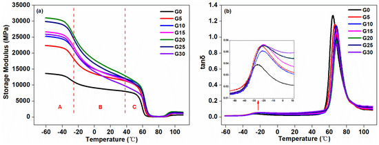 The compatibility and the glass transition temperature (Tg) were often examined by DMA measurements [41]. Figure 6 shows the plot of the storage modulus and loss factor of the composites as a function of temperature. As shown in Figure 6a, the storage modulus of the composite material can be characterized by three regions, i.e., Regions A, B, and C. In Region A, the storage moduli of the graphite-added composites were higher than that of the control composite without graphite, which indicated that the rigidity of the composites was increased after the addition of graphite. This was because of the presence of the dispersed graphite, which was a kind of stiff filler. Moreover, the chain mobility of the composite was limited in this region, so the storage modulus of the composites in Region A was the largest among the three regions. As the graphite content increased, the storage moduli of the composites increased, and when the addition amount was 25 pbw, the storage modulus was the largest. Continually increasing graphite to 30 pbw, the storage modulus dropped suddenly. In Region B, the storage moduli of the graphite-added composites were still higher than the control. With the temperature increasing, the storage modulus suddenly reduced, which may be due to the aggregation of the graphite [42]. The composite with the graphite addition of 30 pbw had the largest reduction in storage modulus, and this sudden drop suggested a high degree of aggregation of graphite dispersed in the matrix. In Region C, as the temperature increased, the storage moduli of the composites dropped sharply, which was attributed to the fact that the frozen segmental motion of the composites began to be released as the temperature increased to around the glass transition temperature. When the temperature was higher than the glass transition temperature and continually increased to 70 °C, the movement of the composite segment was free, and the storage modulus of the composites remained substantially unchanged.