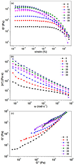 The complex viscosity as a function of frequency can be observed in Figure 7b. All composites showed a shear thinning behavior, which was the typical characteristic of non-Newtonian fluids. As the graphite content increased, the complex viscosity of the composite increased, because more solid fillers added into the composites may require a greater shearing rate to achieve the critical shear flow [44]. The shear thinning behavior was enhanced, due to the more solid-like behavior [45]. However, when the addition amount reached 30 pbw, the complex viscosity of the composite suddenly decreased, which may be due to the excessive graphite addition leading to agglomeration and making the filler particles larger. Therefore, the possible network formed by the graphite might be a reason for the solid-like response of the graphite-added composites [42]. This is consistent with the composites’ morphology observed previously.