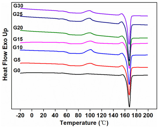The second heating curves of the composites measured by DSC are shown in Figure 8, and the characteristic values of the curves are shown in Table 4. It can be seen that the cold crystallization of the composite without graphite occurred at 95.88 °C, followed by a melting peak at 167.70 °C. Since the TPU component in the matrix was amorphous, the crystallization behavior of the composites was attributed to the PLA component. With the addition of graphite, the cold crystallization temperature of the composites increased. This may be due to the addition of a certain amount of graphite, which could restrict the motion of the PLA chains, thereby limiting the cold crystallization process of the PLA, resulting in an increase in the cold crystallization temperature of the PLA in the composites [47,48]. With the increasing loading of graphite in the composites, no significant changes were observed in the fusion points. The crystallinity of G25 was almost the same as G0, which was consistent with the mechanical properties.