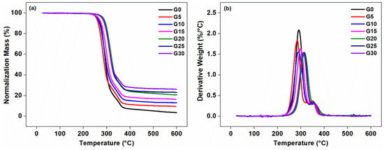 Thermalgravimetric analysis (TGA) curves (a) and derivative thermalgravimetric analysis (DTG) curves (b) of the composites with varying graphite content.