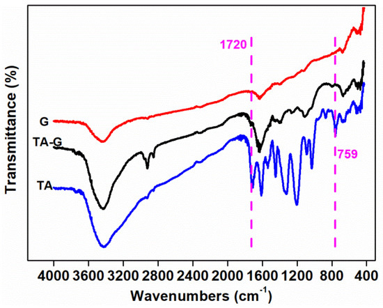Figure 10 shows the FTIR spectrum of TA, G, and TA-G. For G, the characteristic absorption peaks at 3423, 1630, and 674 cm−1 represented the stretching vibration of O–H, the stretching vibration of C=C group, and the bending vibration of C–H, relatively. Compared with G, new characteristic absorption peaks of TA-G at 1720 cm−1 and 795 cm−1 were related to the stretching vibration of –C=O group and the bending vibration of C–H on the benzene. Some of the characteristic absorption peaks enhanced, which were at 2924, 2854, 1630, 1112 cm−1, indicating the bending vibration of –CH3, –CH2, the stretching vibration of C=C, and the =C–O–C group. The enhancement in intensities was due to the introduction of TA on the one hand and the exfoliation of a few graphene layers from graphite during the preparation process on the other hand. The results showed that the characteristic peaks of TA can be observed also at the TA-G, which suggested that TA was successfully functionalized G by the π–π conjugative effect [52,53].