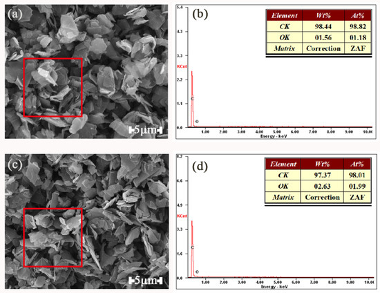 SEM Photographs of G (a) and TA-G (b) and EDX spectrum of G (c) and TA-G (d).