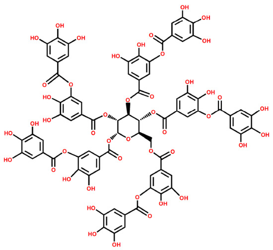 Figure 11 shows EDX spectrum and SEM images of G and TA-G. The red square represents the area of the X-ray scan spectrum. The data in the table represented the relative mass fraction and atomic percentage of carbon and oxygen in the graphite before and after the modification, respectively. The molecular formula of TA is C76H52O46 and the structural formula is shown in Figure 12. The atomic percentage of the oxygen atoms in TA-G (1.99%) was obviously higher than that in G (1.18%), which further proved that the molecules of TA were successfully adsorbed onto G.