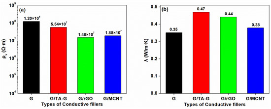 The electrical resistivity and the thermal conductivity are shown in Figure 13. The addition of TA-G slightly reduced the electrical resistivity of the composite, and the thermal conductivity increased to 0.47 W/m·K. This may be due to the better-dispersed of TA-G in the matrix, improving the interfacial compatibility. The enhanced interfacial affinity between G and the matrix can decrease the interfacial thermal resistance and phonon scattering, resulting in the increasing thermal conductivity. The best effect was the combination of G and rGO, which reduced the electrical resistivity of the composite by an order of magnitude and increased the thermal conductivity by 25.71%. With the addition of MCNT, the resistivity of the composite reduced by 84.33%, which, however, did not reach an order of magnitude, and the thermal conductivity was hardly improved.