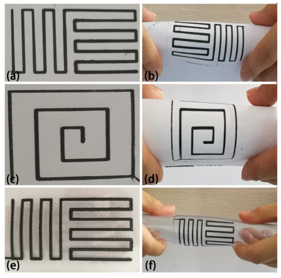 The PLA/G-rGO composite was chosen to print the models by FDM, due to the better electrical resistivity and the thermal conductivity. As shown in Figure 14, the single layer models were printed on different baseplates, such as (a) and (c) on the paper, (e) on the flexible materials. The combination of the printing filaments and the baseplate were better, and by bending the baseplate, it can be seen that the printed model had a certain flexibility and cannot be separated from the baseplate when the baseplate was bent.