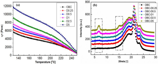(a) Temperature dependence of complex viscosity as a function of DMDBS concentration during cooling at 2 °C/min and after annealing at 260 °C for 10 min; (b) 1d-wide-angle X-ray diffraction (WAXD) diffraction intensity as a function of 2θ for OBC/DMDBS composites.