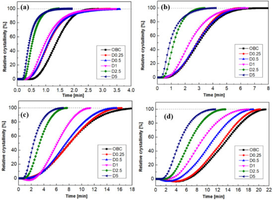 Figure 4 shows the curves of relative crystallinity (Xt) of the OBC/DMDBS composites as a function of different contents of DMDBS under different isothermal conditions. It is obvious that adding DMDBS into an OBC matrix increases the crystallization rate. With the increase of DMDBS content, the acceleration effect is more remarkable. The general trend is that, the crystallization of OBC is faster at lower crystallization temperature and only a large addition of DMDBS shows a significant accelerating effect. At higher crystallization temperatures, the crystallization rate of OBC slows down. When adding a small amount of DMDBS, it is obvious to get a fast crystallization process for the OBC system. For the isothermal crystallization processes, the first half of exothermic peak is commonly ascribed to the nucleation through the epitaxy of polymer chains onto DMDBS fibrils, while the other half of peak reflects the crystallization growth via self-diffusion of macromolecules into crystal lattice [36]. It could be seen that the slope increased obviously at the initial stage of crystallization and the crystallization completion was also accelerated, which further indicated that DMDBS mainly acted as nucleation points after being precipitated from the OBC melt.